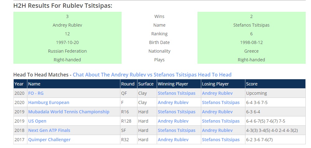 Ήταν 27 Σεπτεμβρίου όταν ο Ρώσος επικράτησε με 2-1 σετ στον ημιτελικό του ATP 500, με τον Τσιτσιπά τώρα να θέλει να του... το επιστρέψει και ταυτόχρονα να γράψει ιστορία. Το συνολικό «σκορ» των δυο είναι 3-2 υπέρ του Ρούμπλεφ, οπότε αντιλαμβάνεται κανείς, πως θα είναι ένα πραγματικό… ντέρμπι αυτό που θα παρακολουθήσουμε στο κεντρικό κορτ του Ρολάν Γκαρός. Η πρώτη συνάντηση του Τσιτσιπά με τον αντίπαλό του, έγινε την 1η Φεβρουαρίου του 2017, όταν ο Ρώσος επικράτησε και τότε με 2-1 σετ στο Κίμπερ της Γαλλίας. Στις 9 Νοεμβρίου 2018 ήρθε η απάντηση από τον Στέφανο Τσιτσιπά, καθώς νίκησε τον Ρώσο τενίστα στο Next Gen Finals σε αγώνα που έγινε στο Μιλάνο, επικρατώντας με 3-2 σετ σε έναν επίπονο και έντονο αγώνα. Ο Αντρέι Ρούμπλεφ, ωστόσο, ήταν αυτός που απέκλεισε τον Στέφανο Τσιτσιπά από το US Open στις 27 Αυγούστου 2019 επικρατώντας με 3-1 σετ και βάζοντας τέλος στα όνειρα του Έλληνα πρωταθλητή μας για διάκριση στις ΗΠΑ εκείνο το καλοκαίρι. Στις 19 Δεκεμβρίου 2019, στο Αμπού Ντάμπι, ο Στέφανος Τσιτσιπάς πήρε μια ακόμα…ρεβάνς από τον Ρούμπλεφ, καθώς τον νίκησε 2-0 και προχώρησε στη διοργάνωση. Δείτε παρακάτω τον πίνακα με τους αριθμούς, τα στοιχεία και τους αγώνες μεταξύ των δύο αντιπάλων: