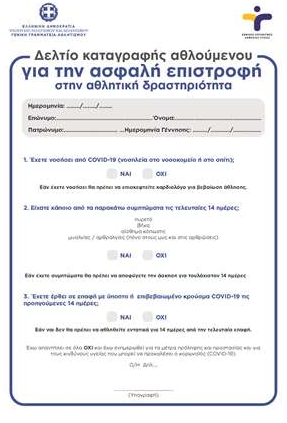 Χρήση των οργανωμένων ανοικτών αθλητικών εγκαταστάσεων μπορούν να κάνουν από σήμερα οι αθλούμενοι πολίτες. Για να γυμναστούν, όμως, απαραίτητη προϋπόθεση είναι η συμπλήρωση και επίδειξη του "Δελτίου καταγραφής αθλούμενου για την ασφαλή επιστροφή στην αθλητική δραστηριότητα".