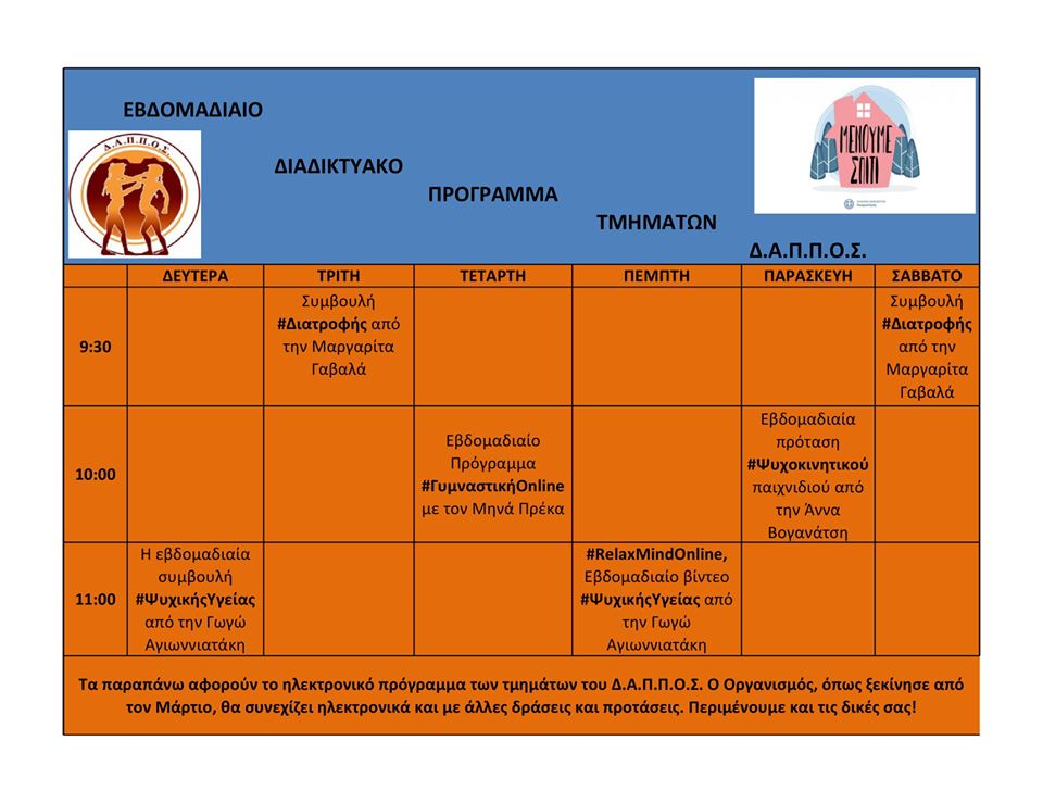Δείτε παρακάτω το πρόγραμμα των διαδικτυακών δαστηριοτήτων του ΔΑΠΠΟΣ: