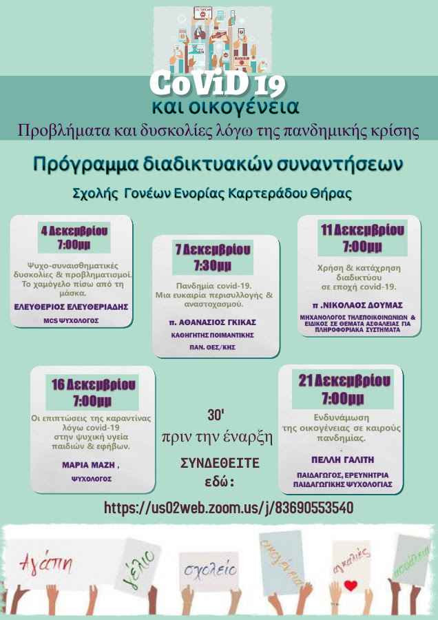 Η ενορία Καρτεράδου διοργανώνει τον Δεκέμβριο μια σειρά πέντε διαδικτυακών συναντήσεων με θέμα “Covid-19 και οικογένεια, Προβλήματα και δυσκολίες λόγω της πανδημικής κρίσης”.