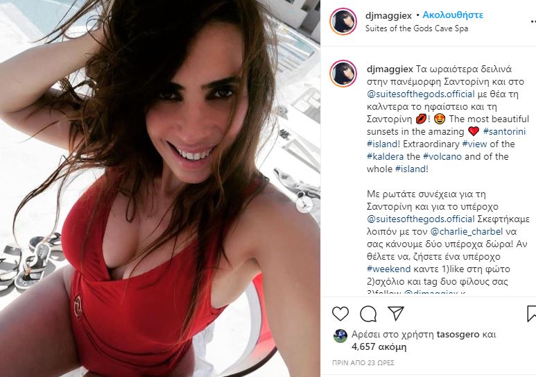 «Τα ωραιότερα δειλινά στην πανέμορφη Σαντορίνη και στο @suitesofthegods.official με θέα τη καλντερα το ηφαίστειο και τη Σαντορίνη» σχολίασε χαρακτηριστικά η Μάγκυ Χαραλαμπίδου στον προσωπικό της λογαριασμό.