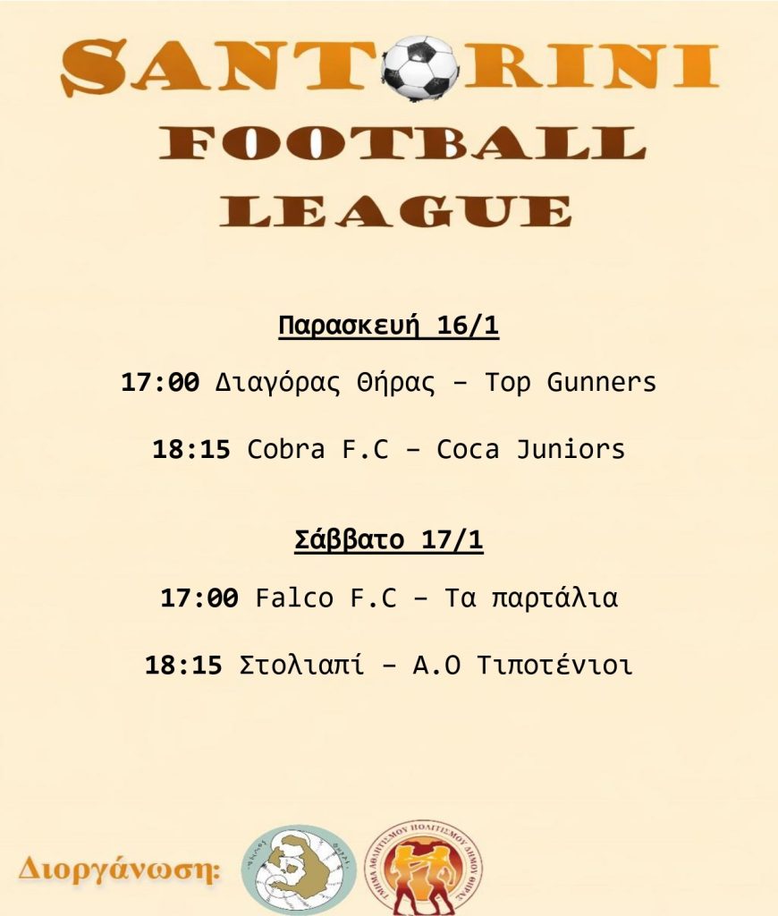 Ξεκινάει σήμερα Παρασκευή 16/01 το τοπικό πρωτάθλημα ποδοσφαίρου που διεξάγεται υπό την αιγίδα του τμήματος αθλητισμού και πολιτισμού του Δήμου Θήρας.