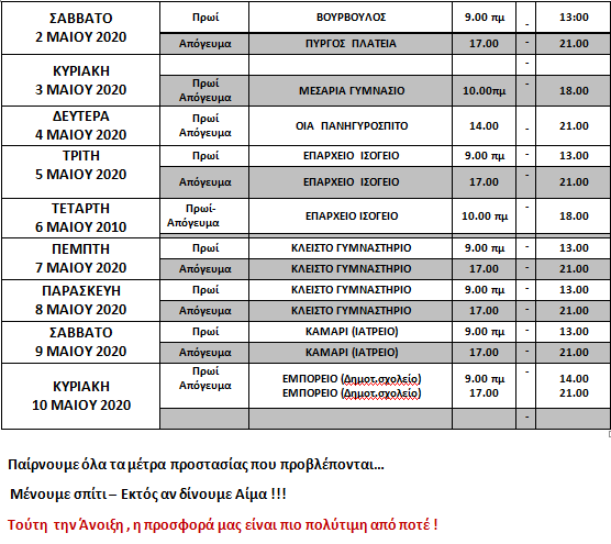 Το ακριβές πρόγραμμα της αιμοδοσίας φαίνεται στον πίνακα που ακολουθεί, ενώ τόσο οι νέοι όσο και οι παλιοί αιμοδότες απαιτείται να έχουν μαζί τους και τον ΑΜΚΑ τους