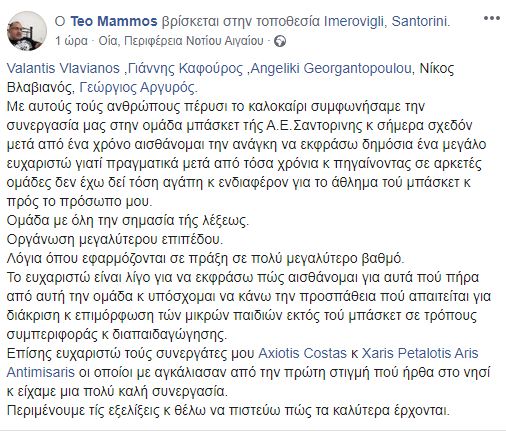 Το δικό του "ευχαριστώ" εξέφρασε μέσω facebook ο τεχνικός της ομάδας Μπάσκετ της Α.Ε. Σαντορίνης, Θοδωρής Μάμμος.