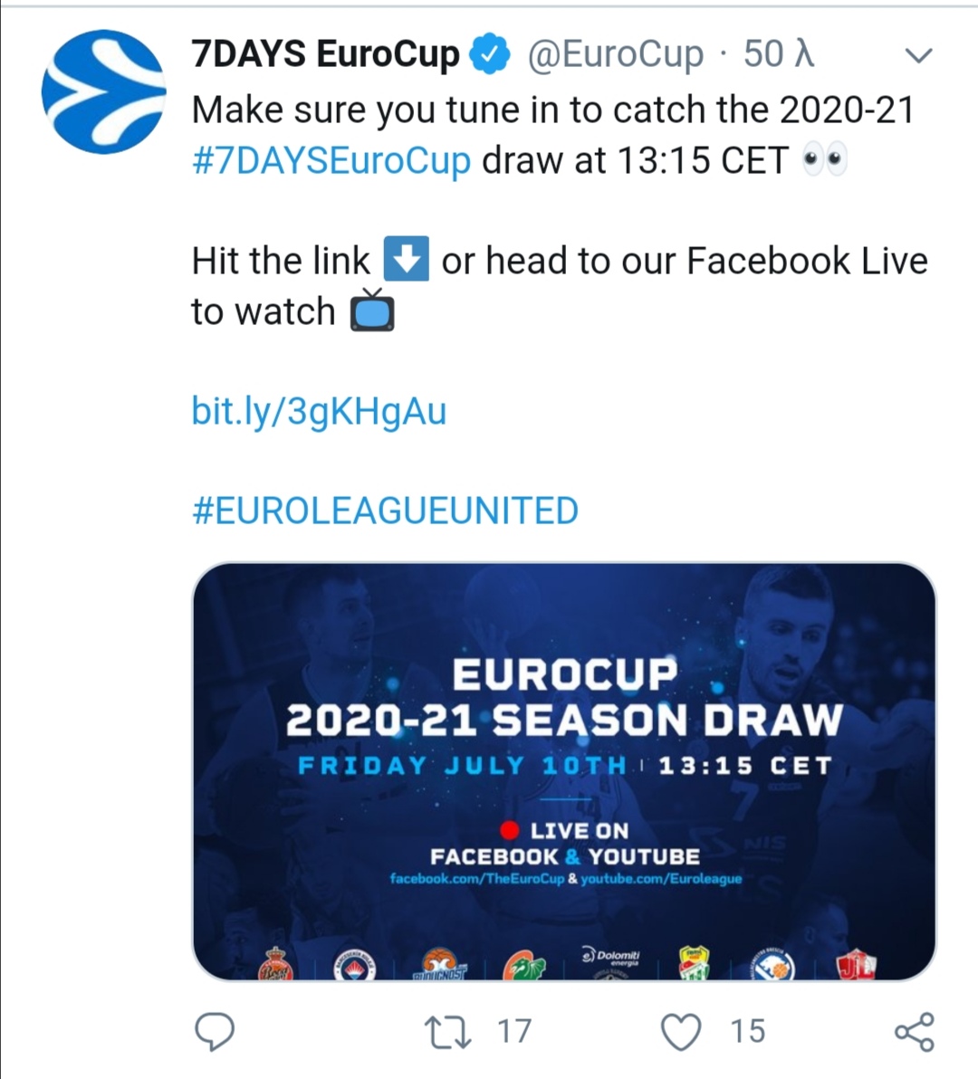 Ήρθε η ώρα για την κλήρωση των ομίλων του EuroCup και ο Προμηθέας Πατρών αναμένει να δει τους αντιπάλους του. Για την ακρίβεια, αυτό θα γίνει σε μιάμιση ώρα από τώρα.