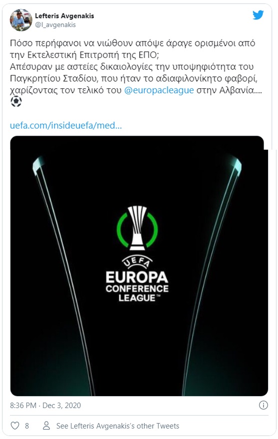 H UEFA ανακοίνωσε ότι η νεοσύστατη τρίτη τη τάξει διασυλλογική διοργάνωσή της, Europa Conference League, ξεκινά στις 8 Ιουλίου 2021 και ο τελικός θα διεξαχθεί - η Ελλάδα είχε αποσύρει το φάκελο που κατέθεσε για το Παγκρήτιο - στα Τίρανα.