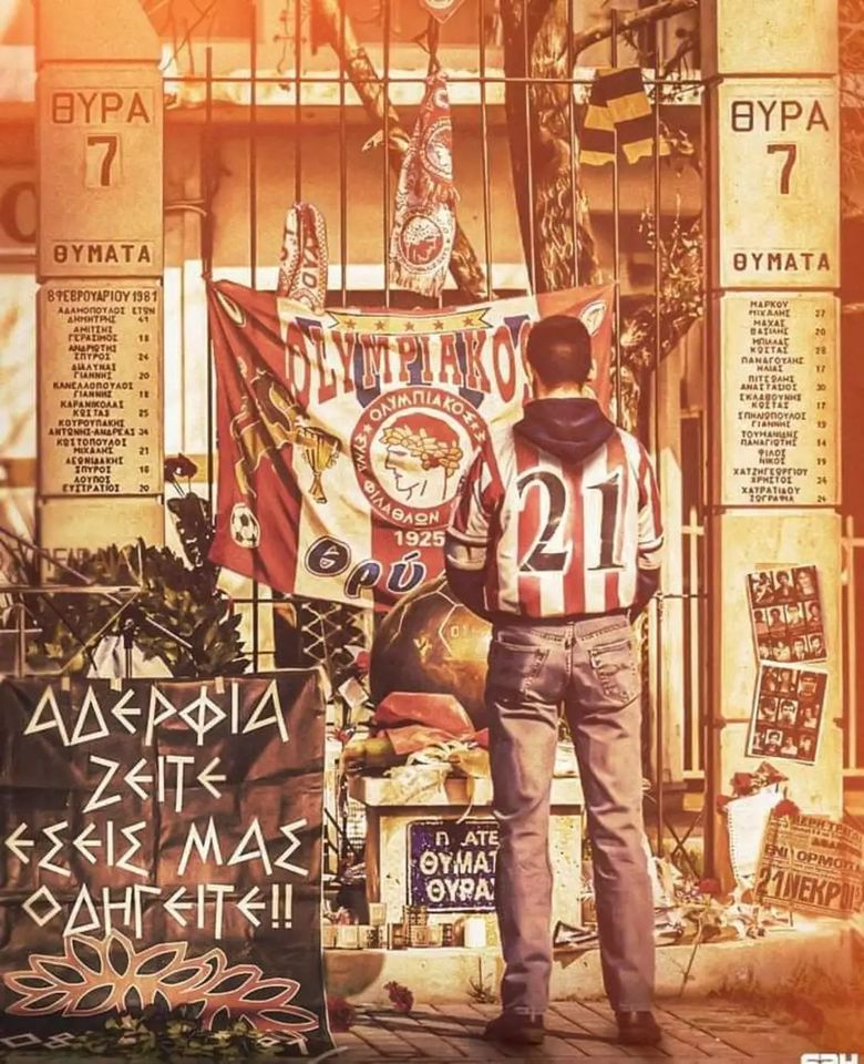 Τελέστηκε σήμερα έξω από το «Γ. Καραϊσκάκης» το ετήσιο μνημόσυνο για τα 21 θύματα της Θύρας 7, που έχασαν τη ζωή τους την αποφράδα Κυριακή 8 Φεβρουαρίου 1981, στους πανηγυρισμούς για τη μεγάλη νίκη της ομάδας τους (6-0) επί της ΑΕΚ στο πρωτάθλημα της (τότε) Α΄ Εθνικής.